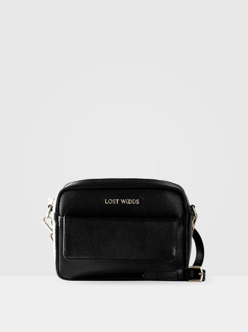 Introducing the Small Aster Crossbody Bag in Black & Gold by Lost Woods. This crossbody camera...