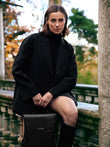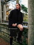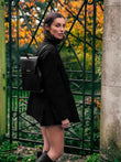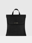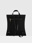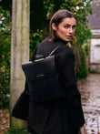 This black structured vegan leather backpack is sophisticated and minimal. Crafted with black textured MIRUM® vegan leather in Portugal, this sustainable luxury piece includes beige GOTS organic cotton lining, a light gold signature 'Lost Woods' monogram, and three card slots on each side.