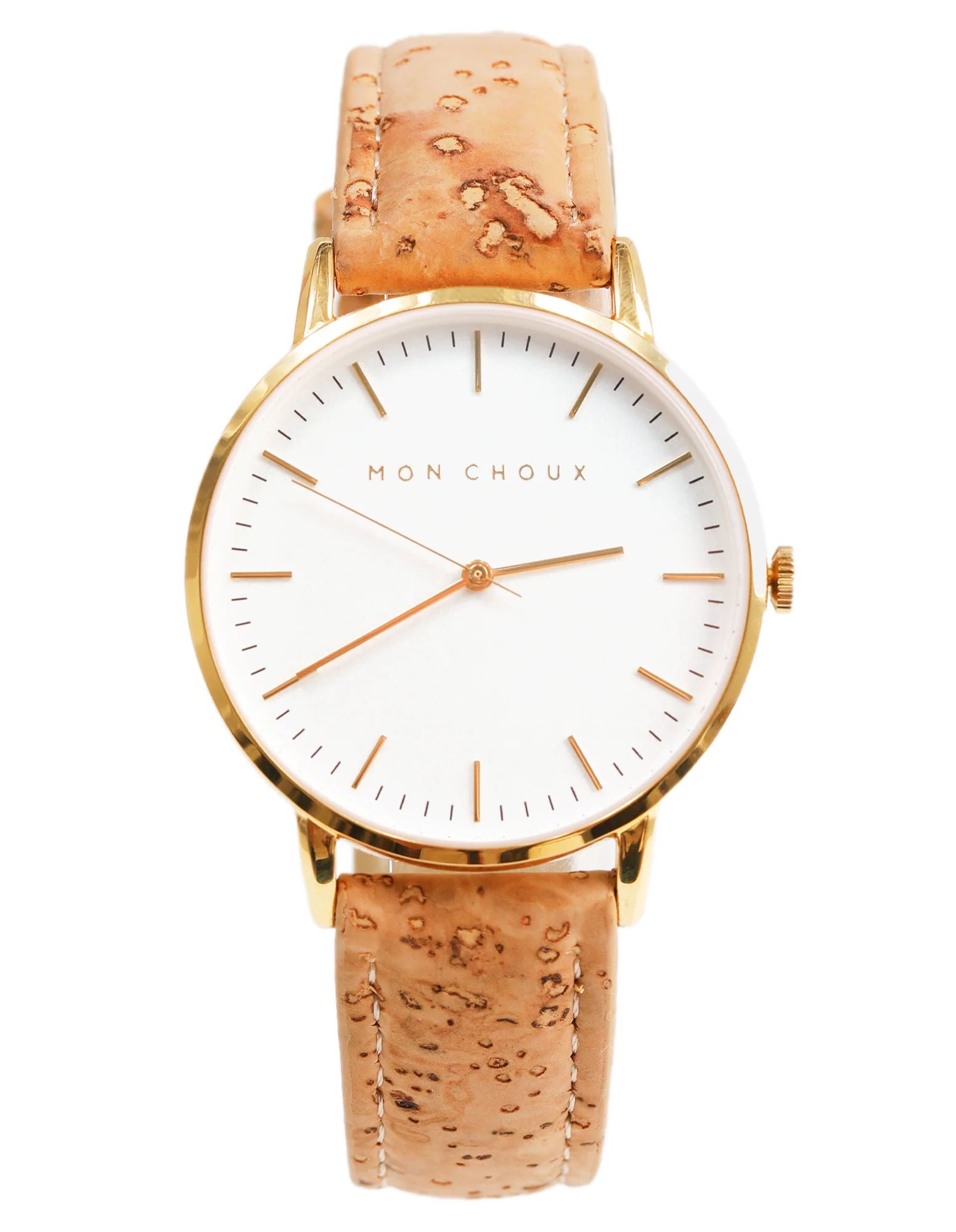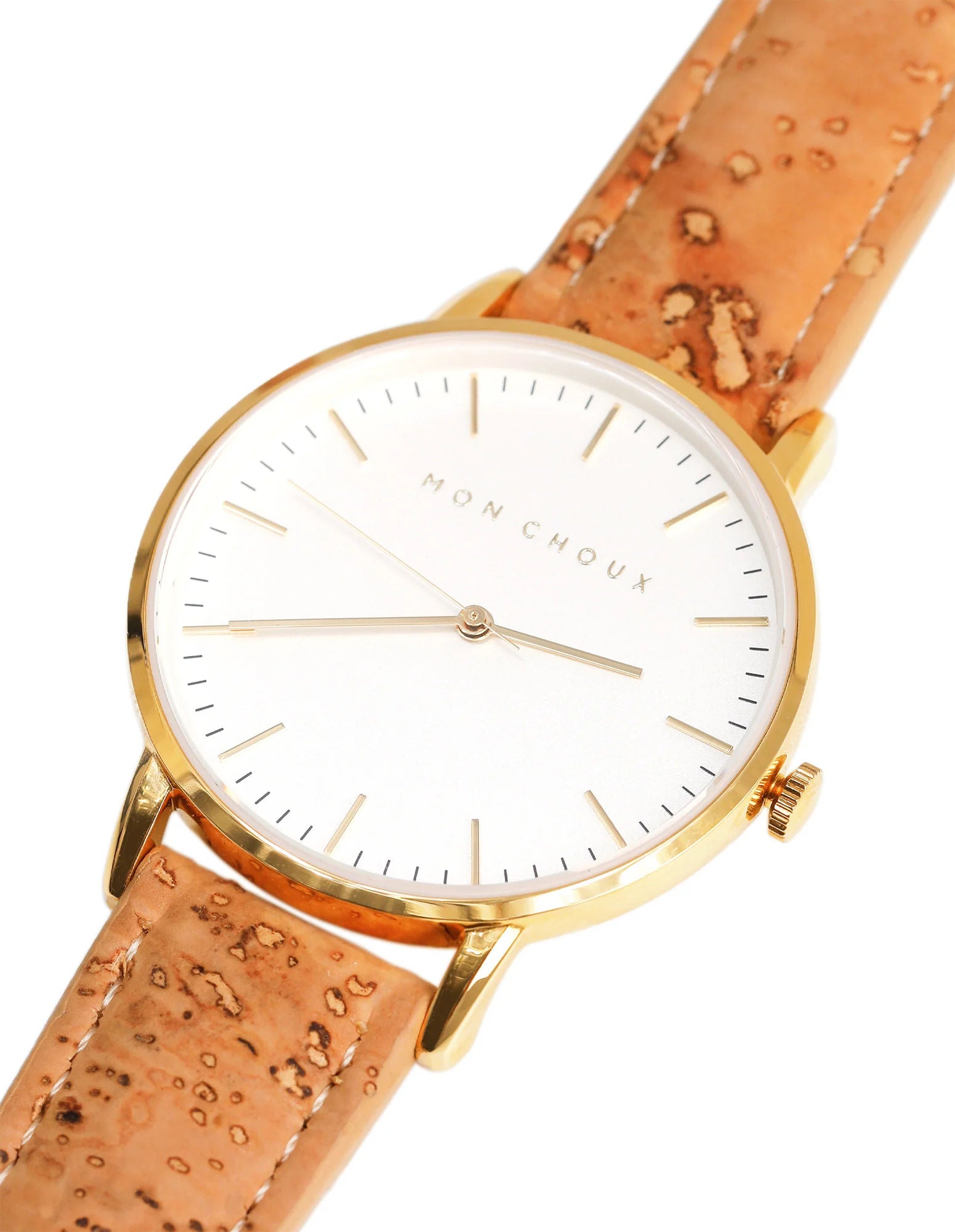 Classic white and gold faced watch in natural vegan eco leather from cruelty free brand Mon Choux.
