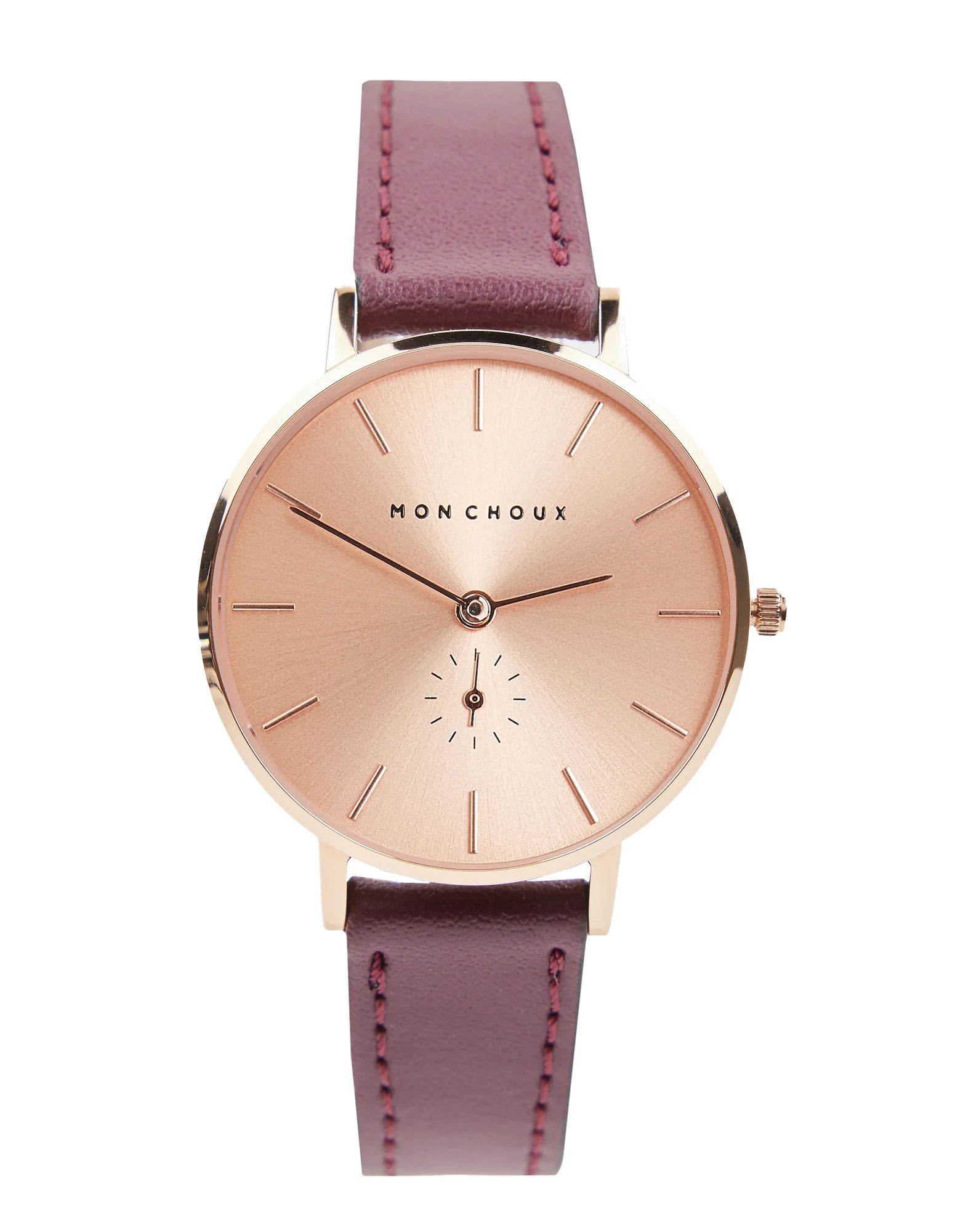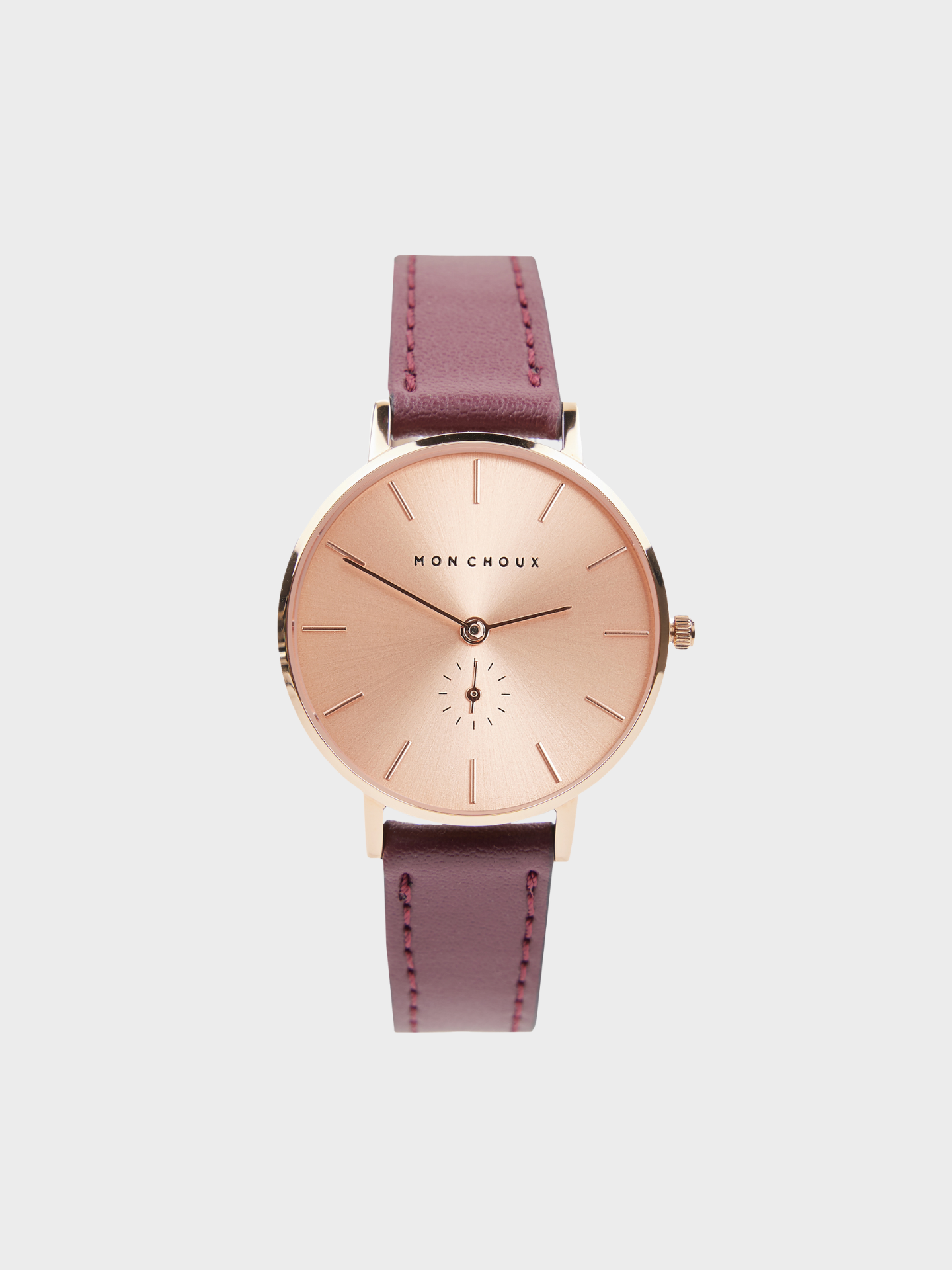 Classic rose gold faced watch in burgundy vegan grape leather from cruelty free brand Mon Choux. Made with VEGEA grape waste, rescued from Italian wineries.