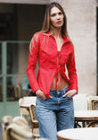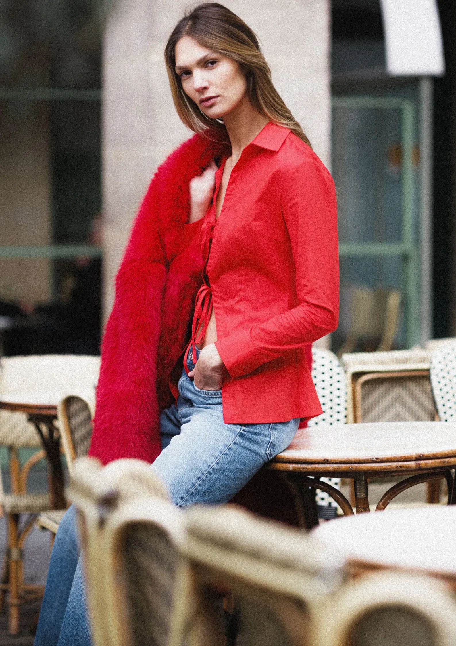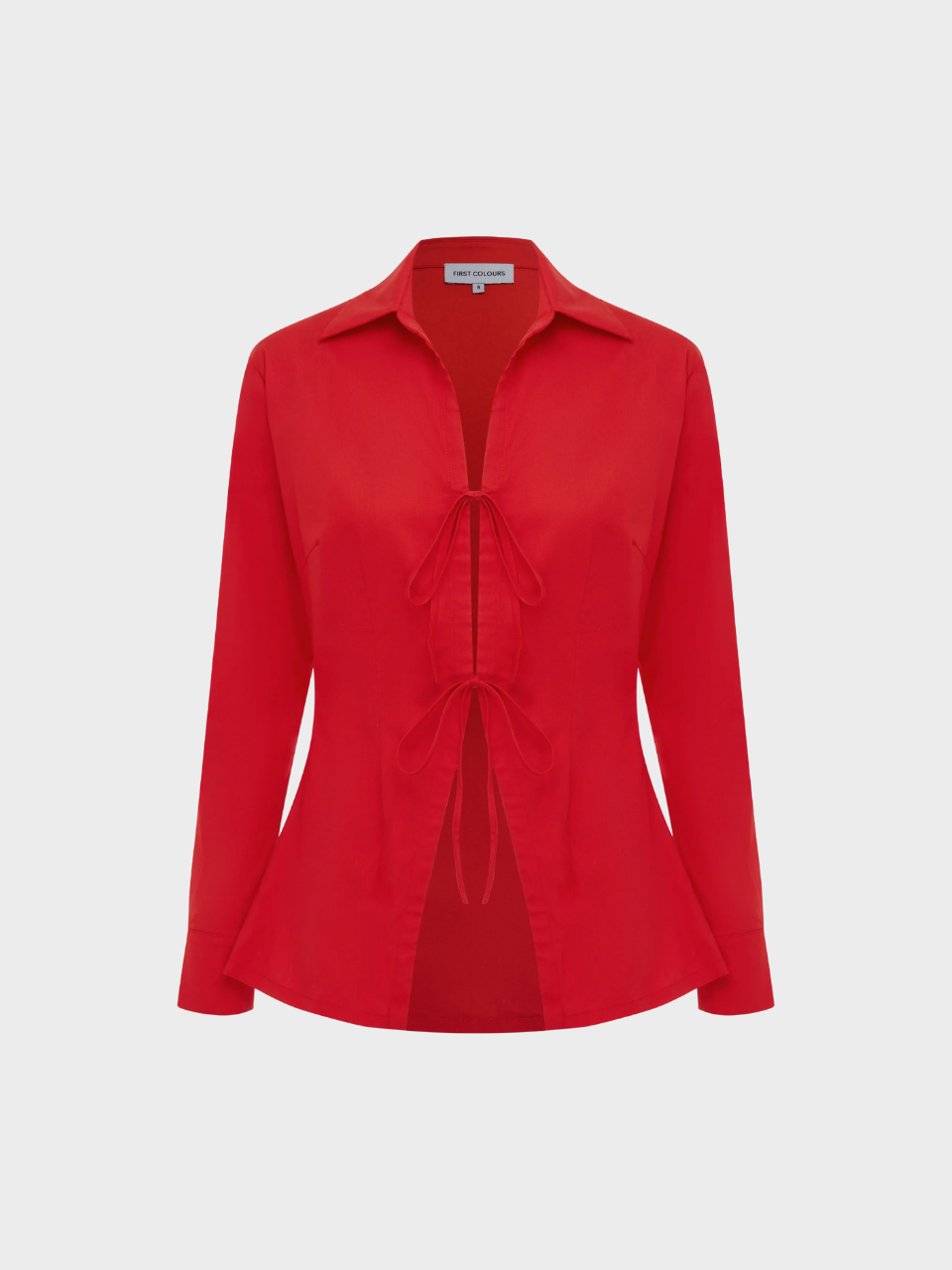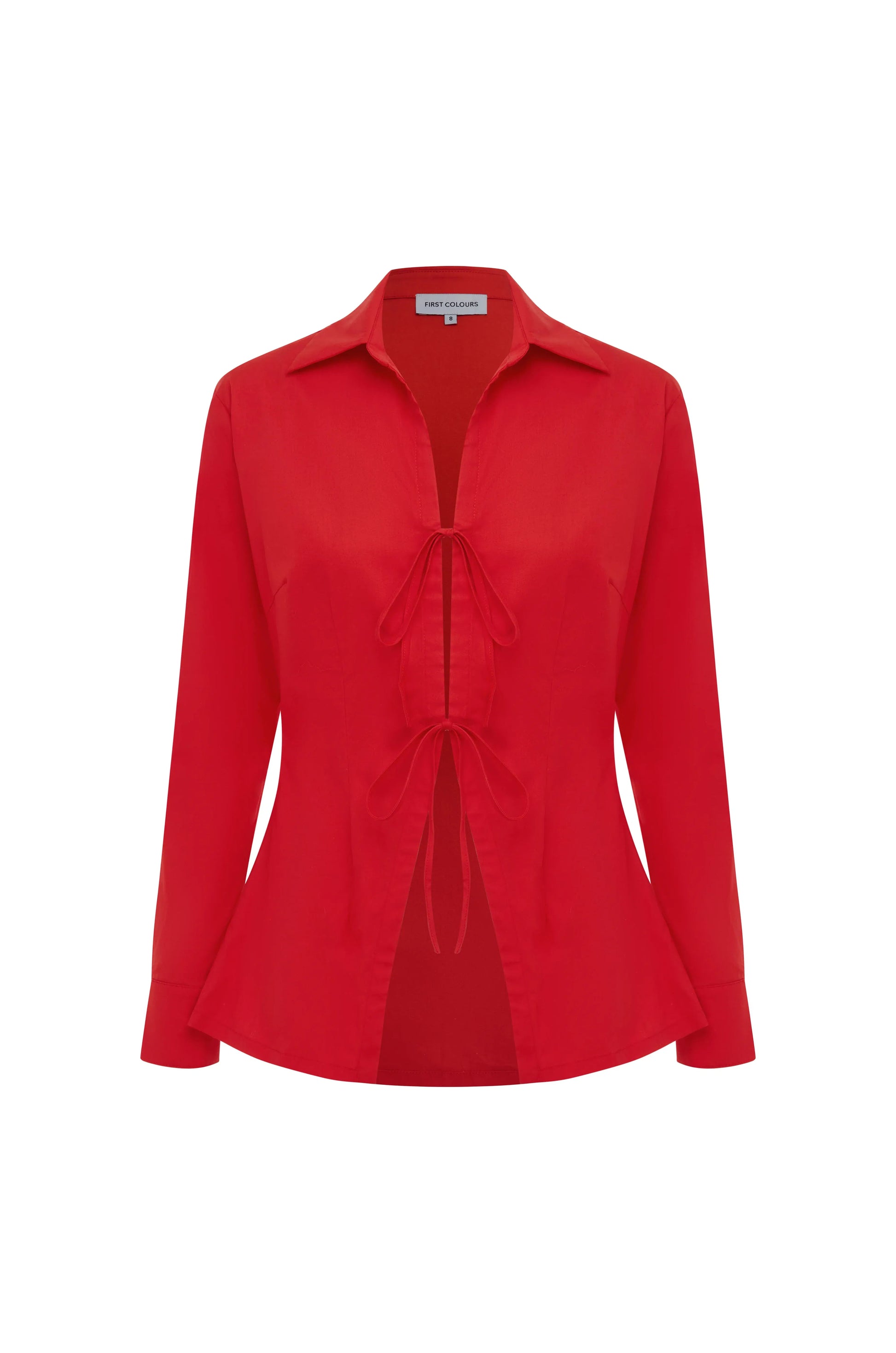 The Soulmate Tie Front Shirt in Strawberry Red by First Colours, crafted from GOTS certified cotton poplin.
