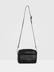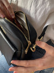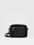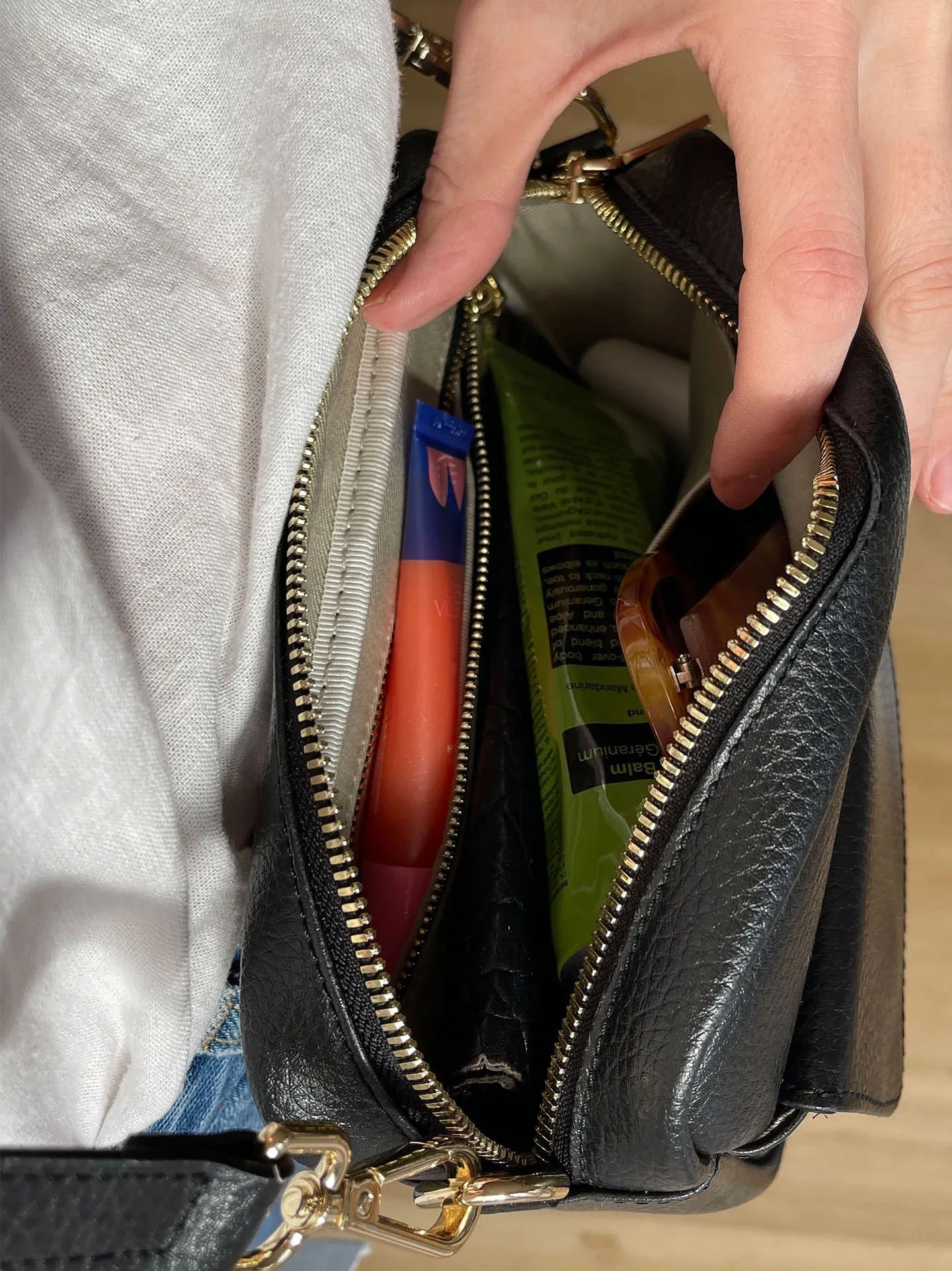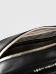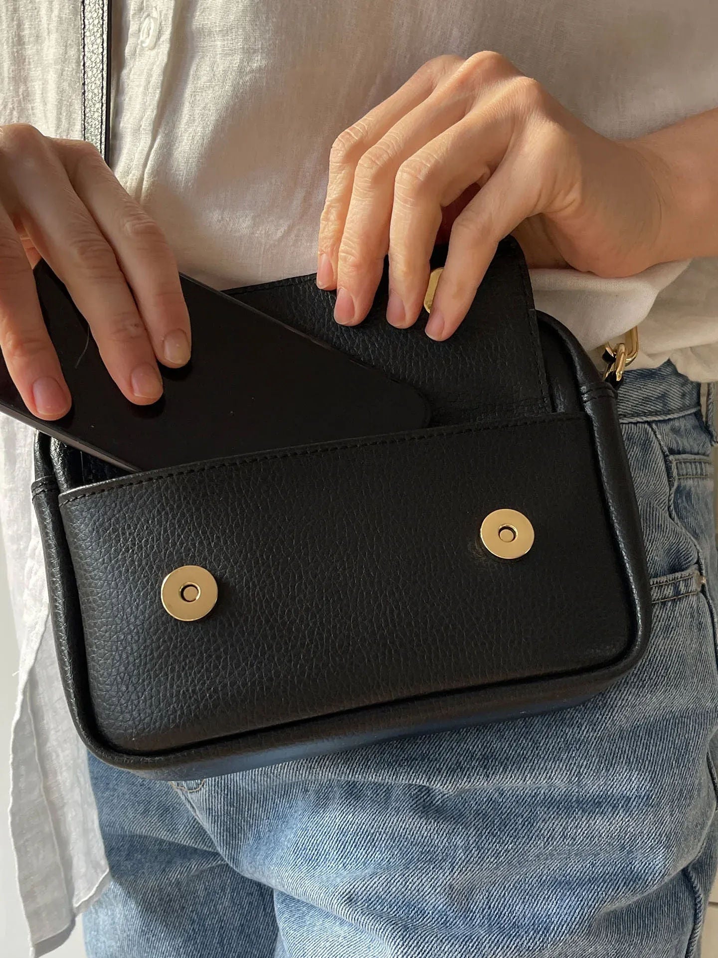 This crossbody camera bag is the smaller version of the classic Aspen camera bag by Lost Woods. Sophisticated and minimal with a thick strap to support all your daily needs. Crafted with black textured MIRUM® vegan leather in Portugal, this sustainable luxury piece includes beige GOTS organic cotton lining, light gold hardware, and a removable thin vegan leather crossbody strap.