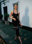 Wear Briar as a crossbody bag with the thick jacquard logo strap, as a shoulder bag with the leather strap, or as a clutch with the box chain. Take the chain off for a minimal look. Crafted with black textured MIRUM® vegan leather in Portugal, this sustainable luxury piece includes beige GOTS organic cotton lining, light gold hardware, and a removable chain strap.