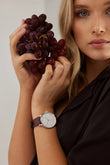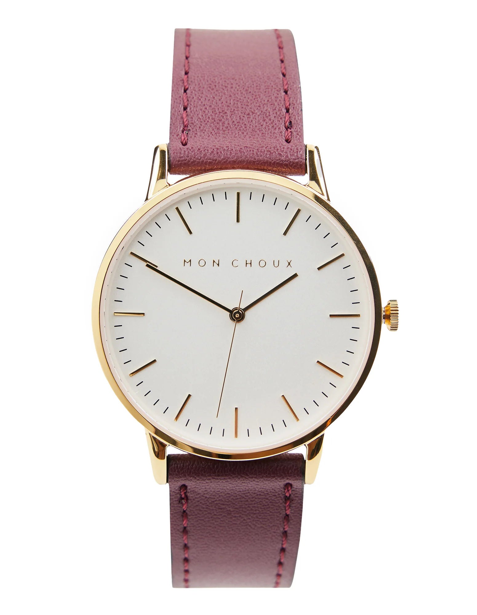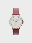 Classic white and gold faced watch in burgundy vegan grape leather from cruelty free brand Mon Choux. Made with VEGEA grape waste, rescued from Italian wineries.
