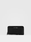 Clementine is a spacious wallet with a removable wrist strap that can be worn out as a clutch. Made from black textured MIRUM® plastic-free vegan leather, light gold hardware and beige organic cotton lining.