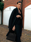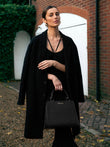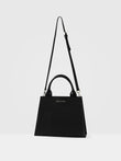 Ebony is an elevated, angular, structured tote handbag with firm handles. Commute hands-free with the removable thin leather crossbody strap. Crafted with black textured MIRUM® vegan leather in Portugal, this sustainable luxury piece includes beige GOTS organic cotton lining, light gold hardware, and a removable chain strap.