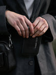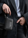 Iris is a compact zip up wallet with an outside pocket detail and a removable wrist strap. Crafted with black textured MIRUM® vegan leather in Portugal, this sustainable luxury piece includes beige GOTS organic cotton lining, silver coloured hardware, and a detachable wrist strap.