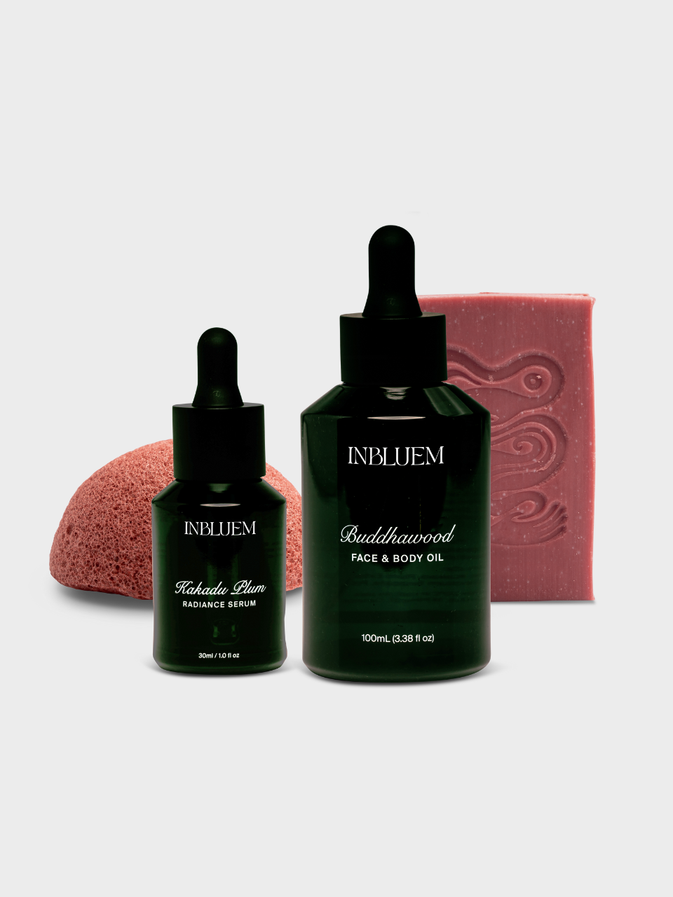 Bluem's Nourish Ritual features their Kakadu Plum Vitamin-C Serum, Soul Cleanser & Konjac Sponge.