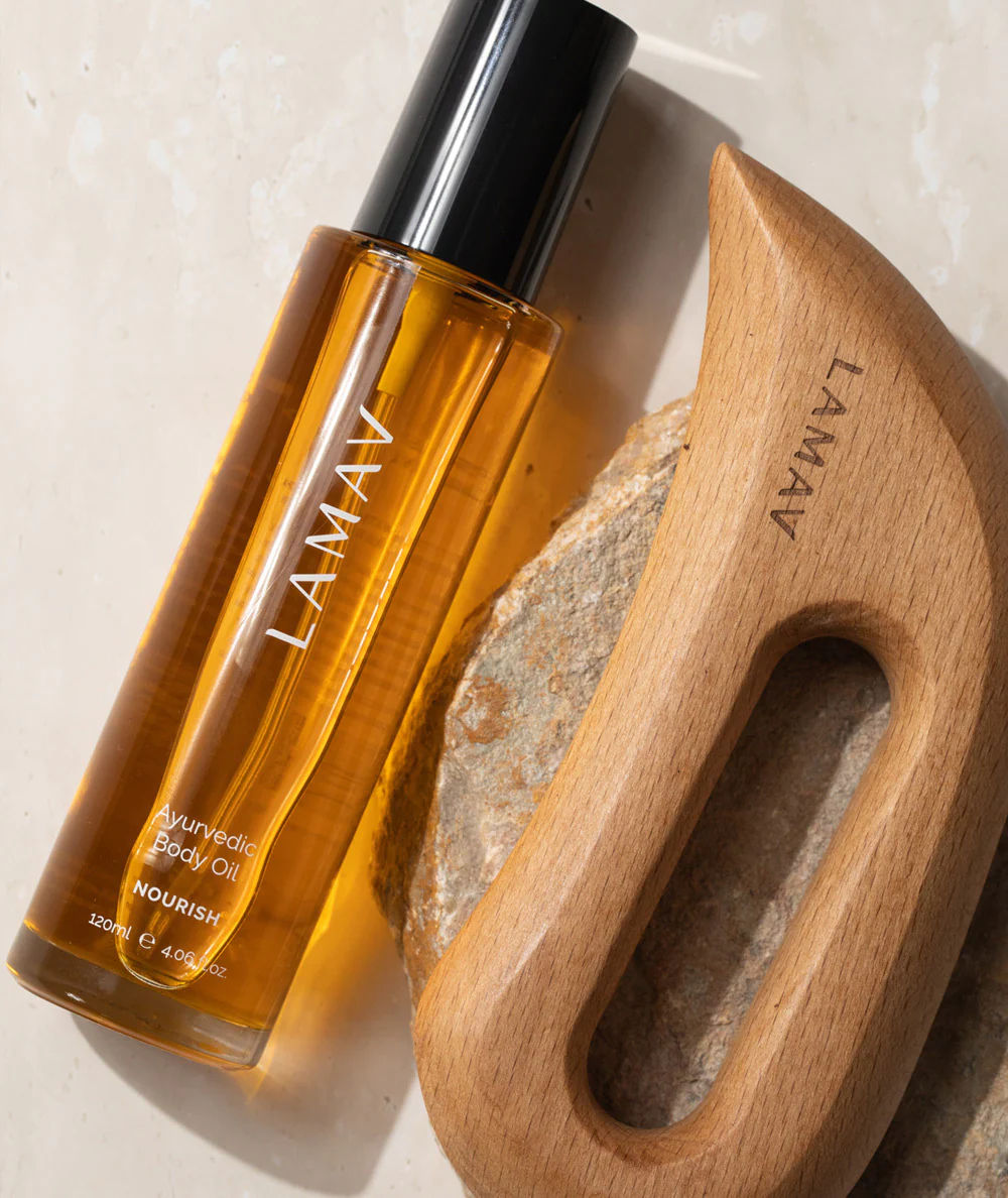 Developed following the traditional Ayurvedic method of incorporating the whole herb in order to obtain the fat-soluble properties of the plant and retain as many of its benefits as possible. LAMAV NOURISH Ayurvedic Body Oil has been made with our proprietary Ayurvedic Wellness Blend.Care for your skin and body with this powerful Ayurvedic Body Oil, containing heart-warming and meditative oils including Sandalwood, Marjoram and Cedarwood. Formulated to inspire your self-care ritual, this unique blend supports mental clarity, balances emotions and enhances serenity. The restorative oil has also been lovingly blended with nourishing essential oils and bio-actives that transform the appearance of dry skin and deliver an intense burst of hydration—leaving skin feeling smooth, supple and soft to touch.