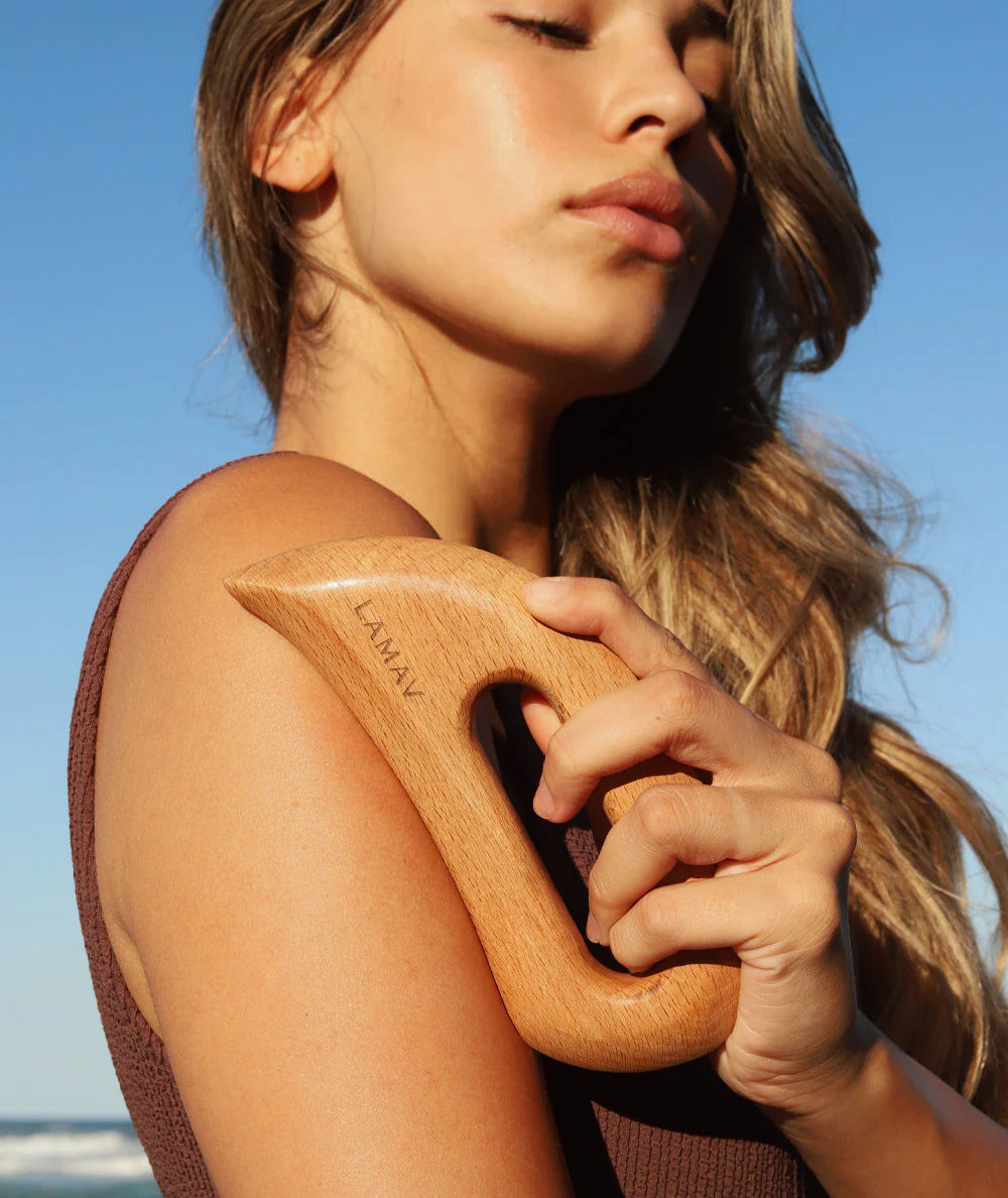 The LAMAV Aura Body Gua Sha has been designed for safe and effective myofascial release at home. The concave side contours to the body while the convex side allows you to target smaller areas.