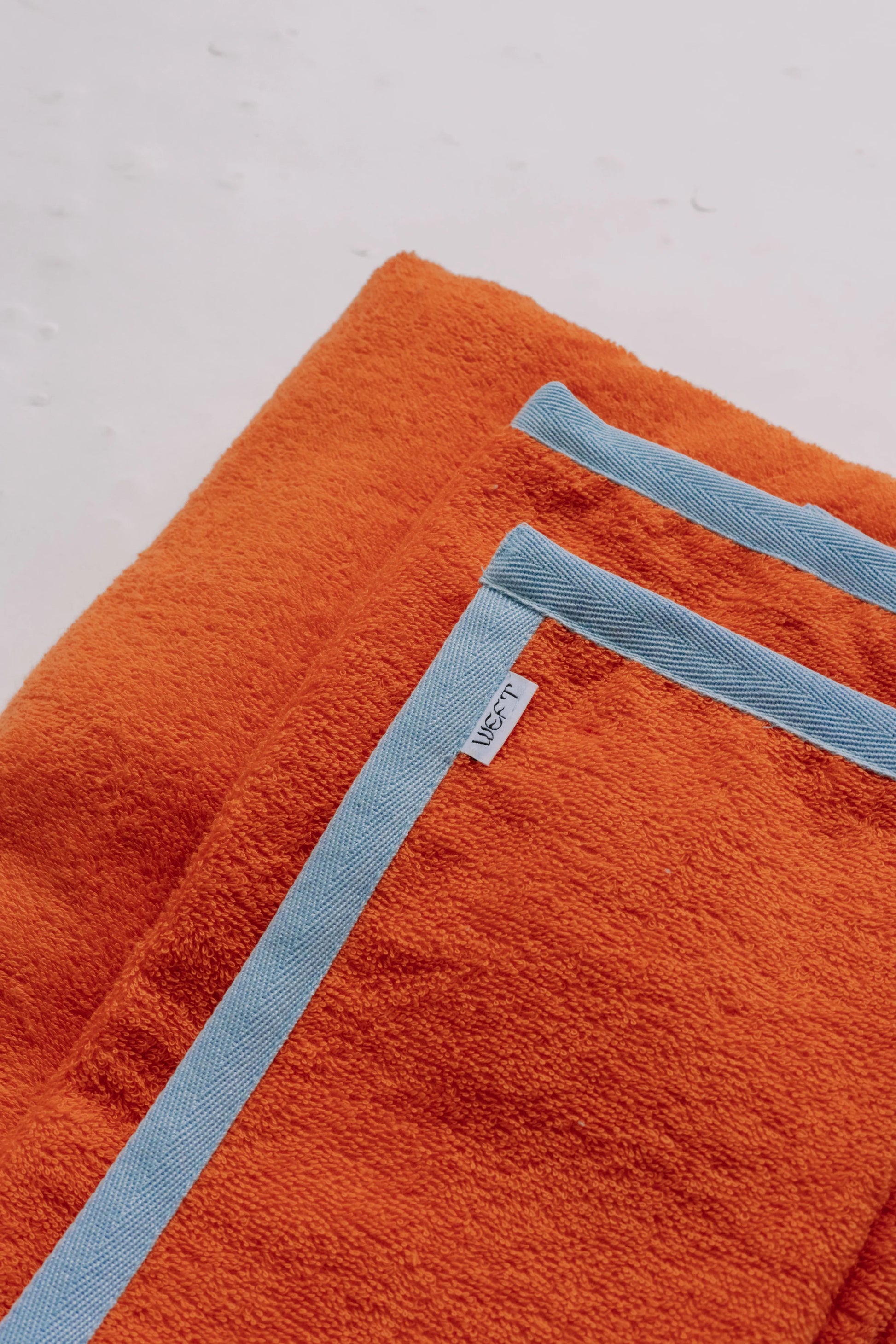 This towel set is in Weft's signature flame colour with a baby blue herringbone contrast border, and is cut and sewn in Adelaide, Australia.